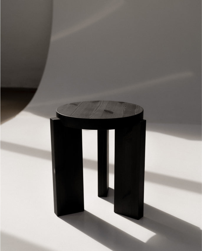 The 001 Stool in Black features a deep black stain, unique to Vaarnii, through which pine's distinctive grain remains pleasingly visible.