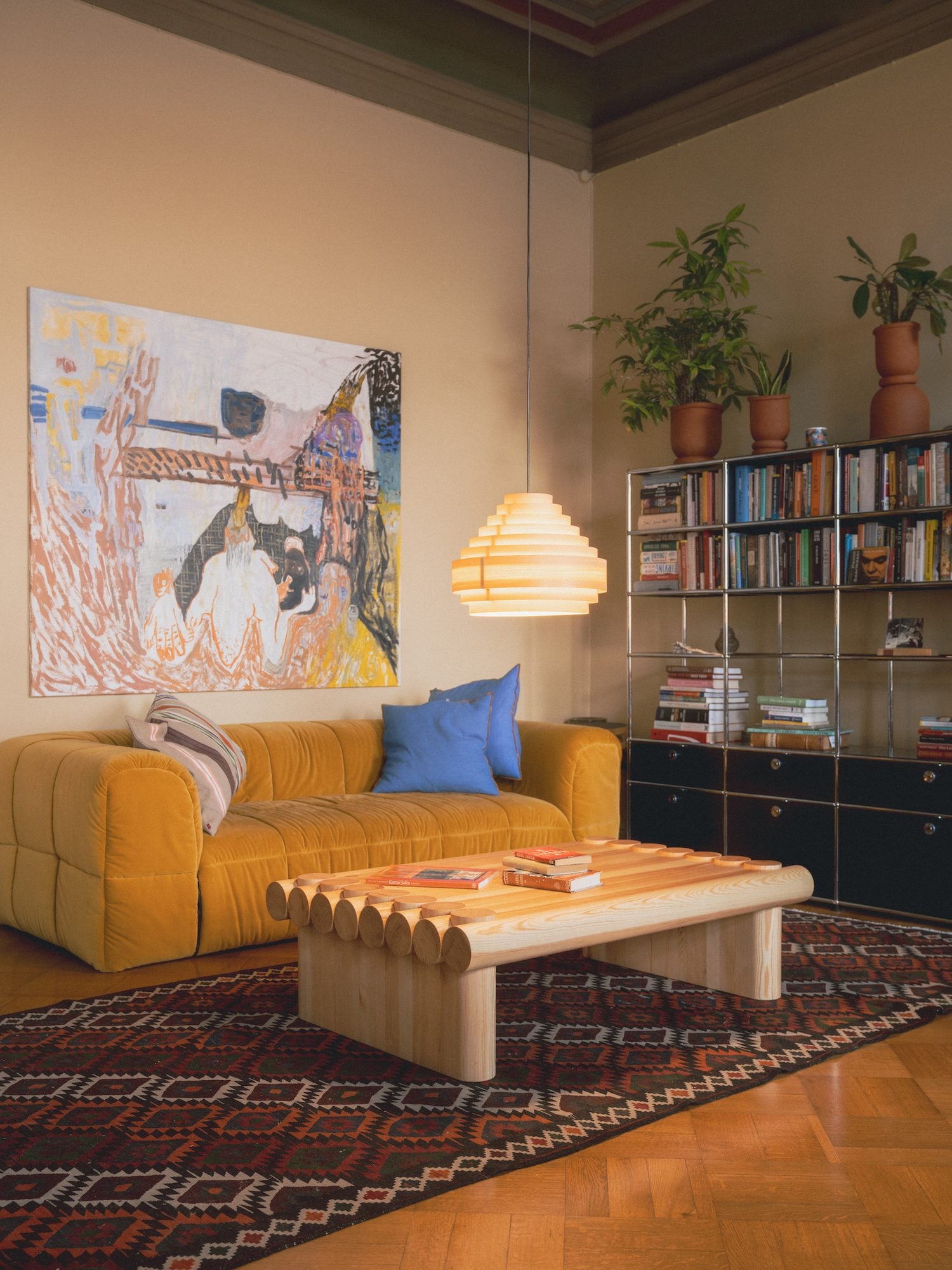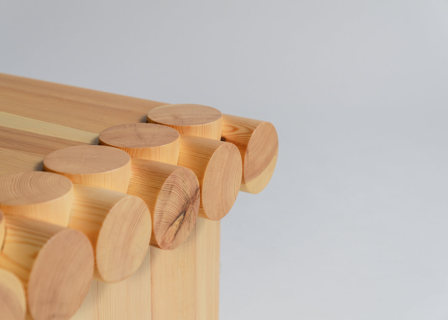 The honest qualities of pine are boldly expressed in Soft Baroque’s wood coffee table. The satisfyingly rational joints of traditional Finnish log houses, themselves a celebration of elementary wooden construction, have been used to decorative effect in this most solid of tables. Round notch joints have been inflated to ‘comic proportions’ by Soft Baroque, who predict that their solid wood coffee table will outlive any of its owners and largely be used for dancing on, given its hulking proportions.