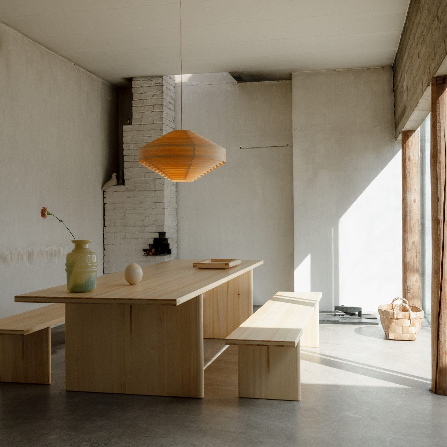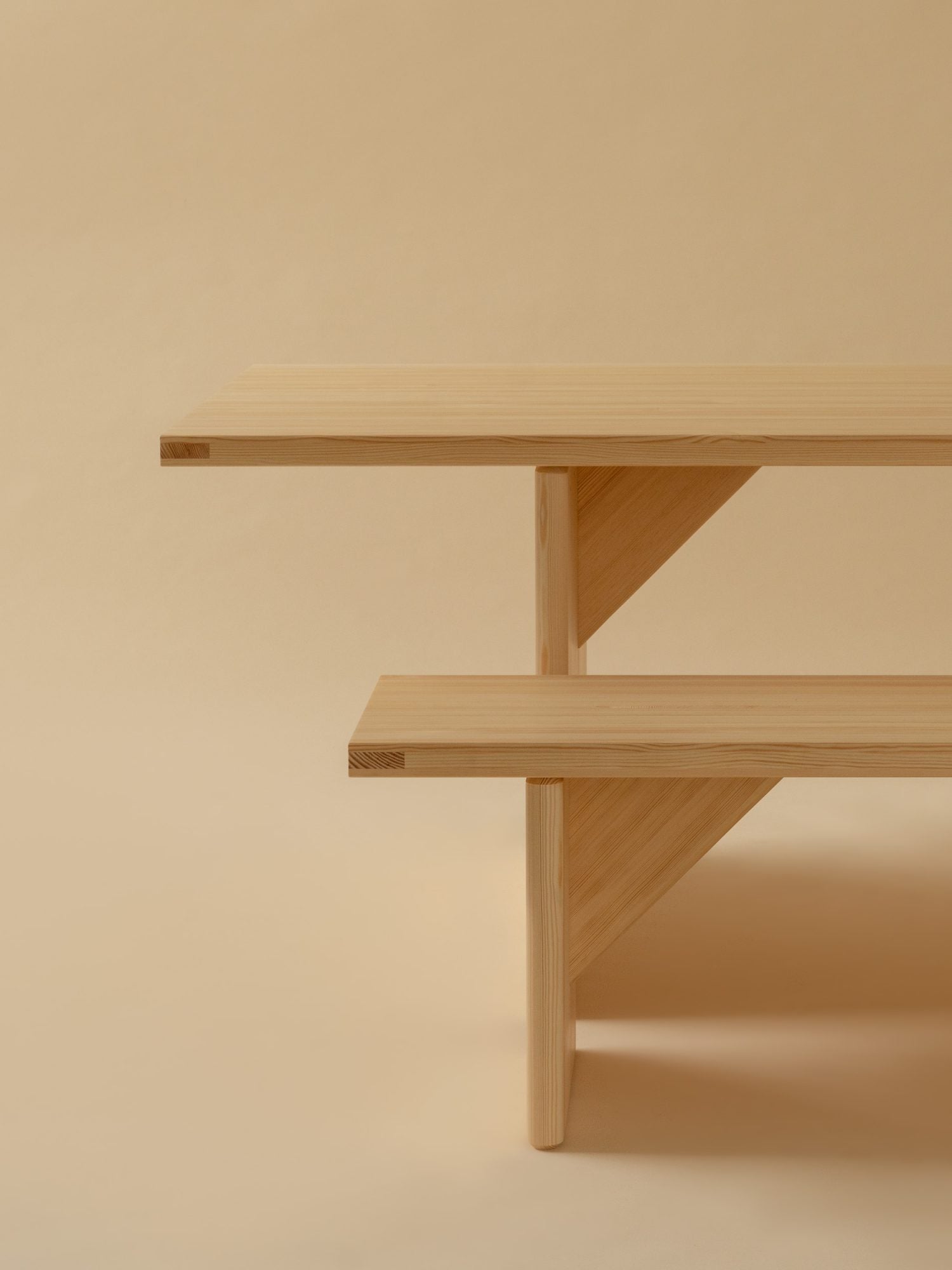 Just like it’s partner, the Kolmio Dining Table, this bench is designed for everyday use. Beneath its seemingly straight-forward form is a unique engineering solution; a sandwich of material made from an inner layer of offcut pine encased by perfect planks. Everything is revealed in the Kolmio’s distinctive and strong profile, only a slight chamfer edge is conceded to soften the severity.