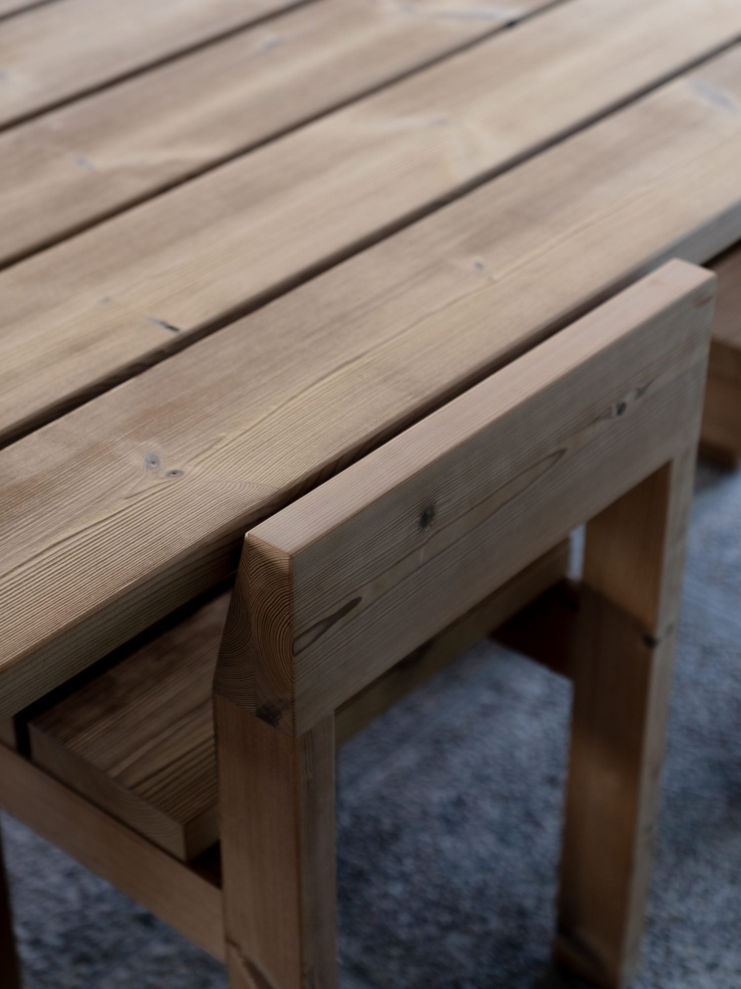 Heat-treated Scots Pine. The Osa outdoor dining table and chairs are made from weather-resistant pine.