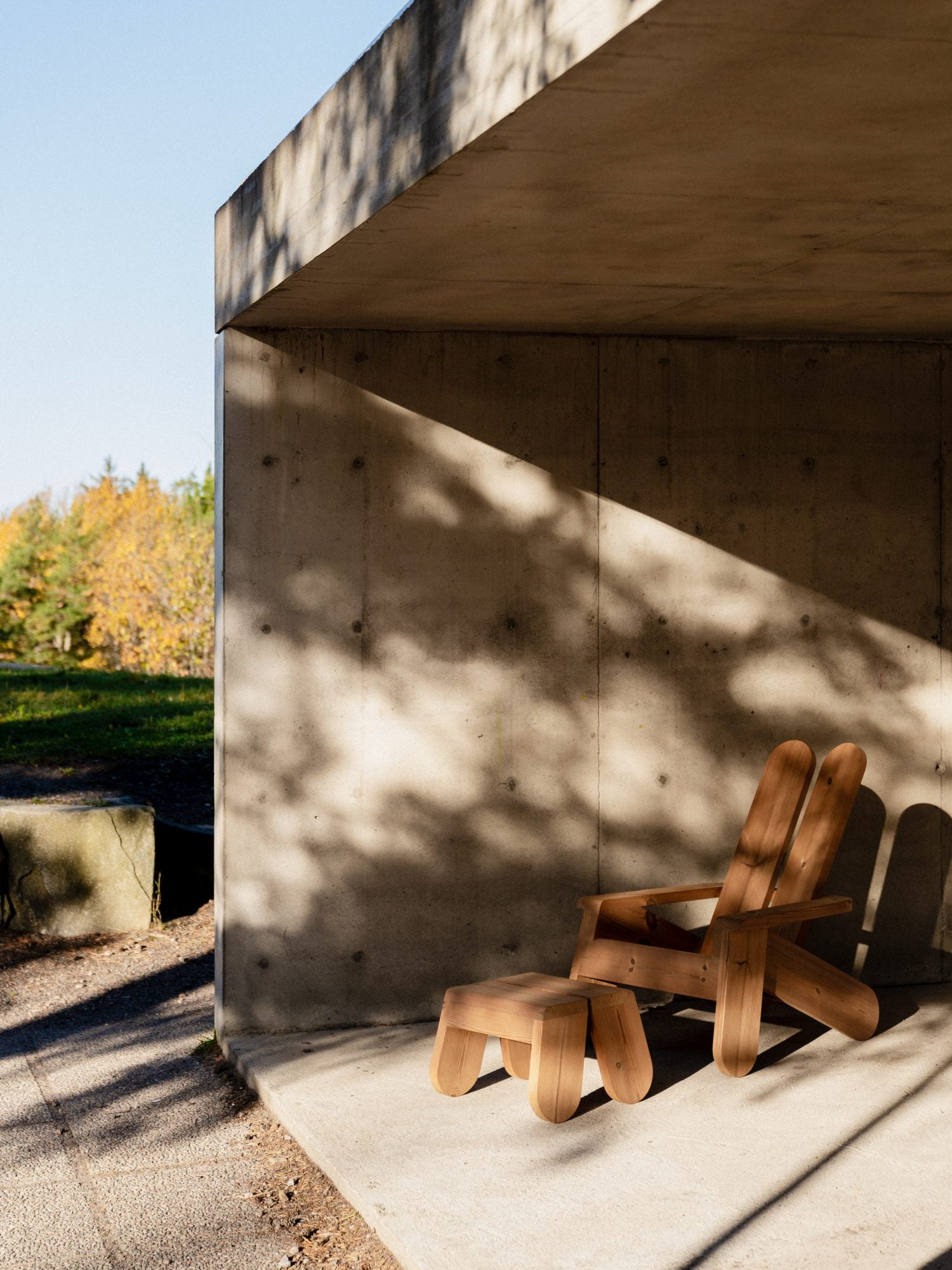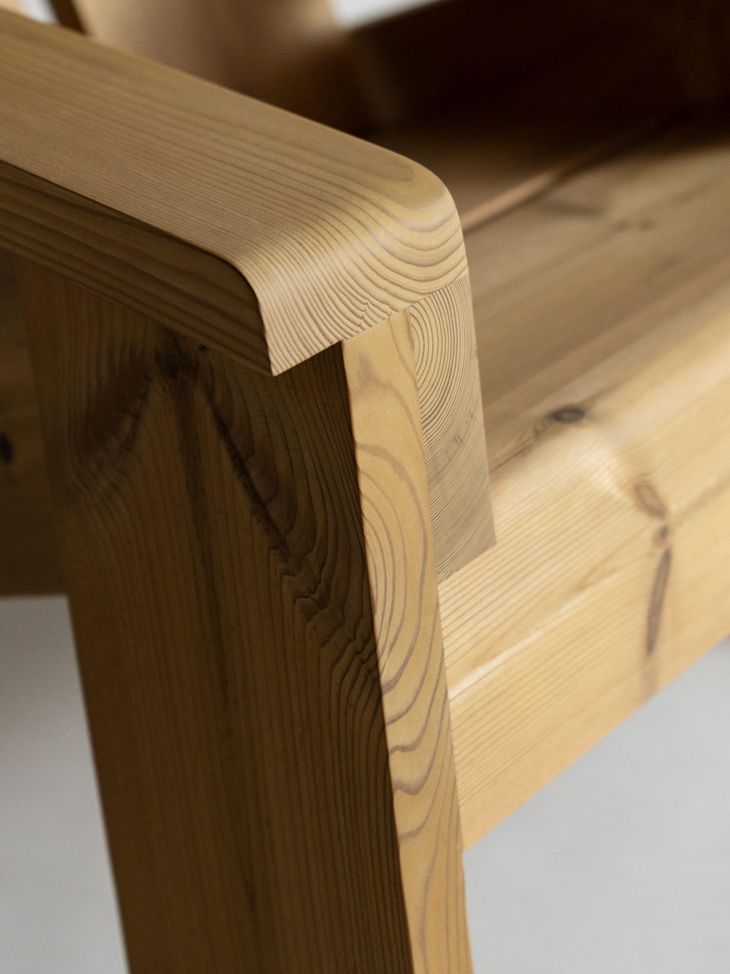 With extreme proportions and explicit ergonomics, this uncompromising outdoor lounge chair by Faye Toogood is pine furniture at its most constructive. Its low profile hugs the earth, a high back provides seclusion and support, and a wide seat and broad armrests offer ultimate sitting comfort.