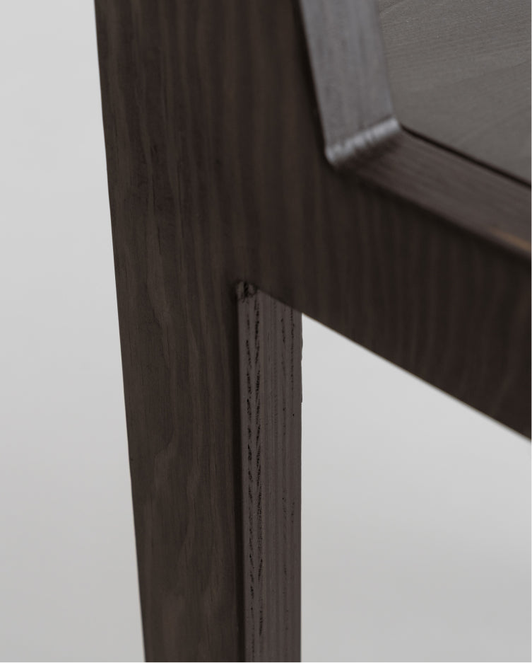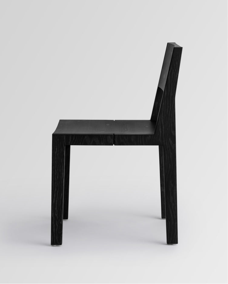 The Maasto Chair in Black features a deep black stain, unique to Vaarnii, through which pine’s distinctive grain remains pleasingly visible—emphasising the material’s raw character rather than concealing it.