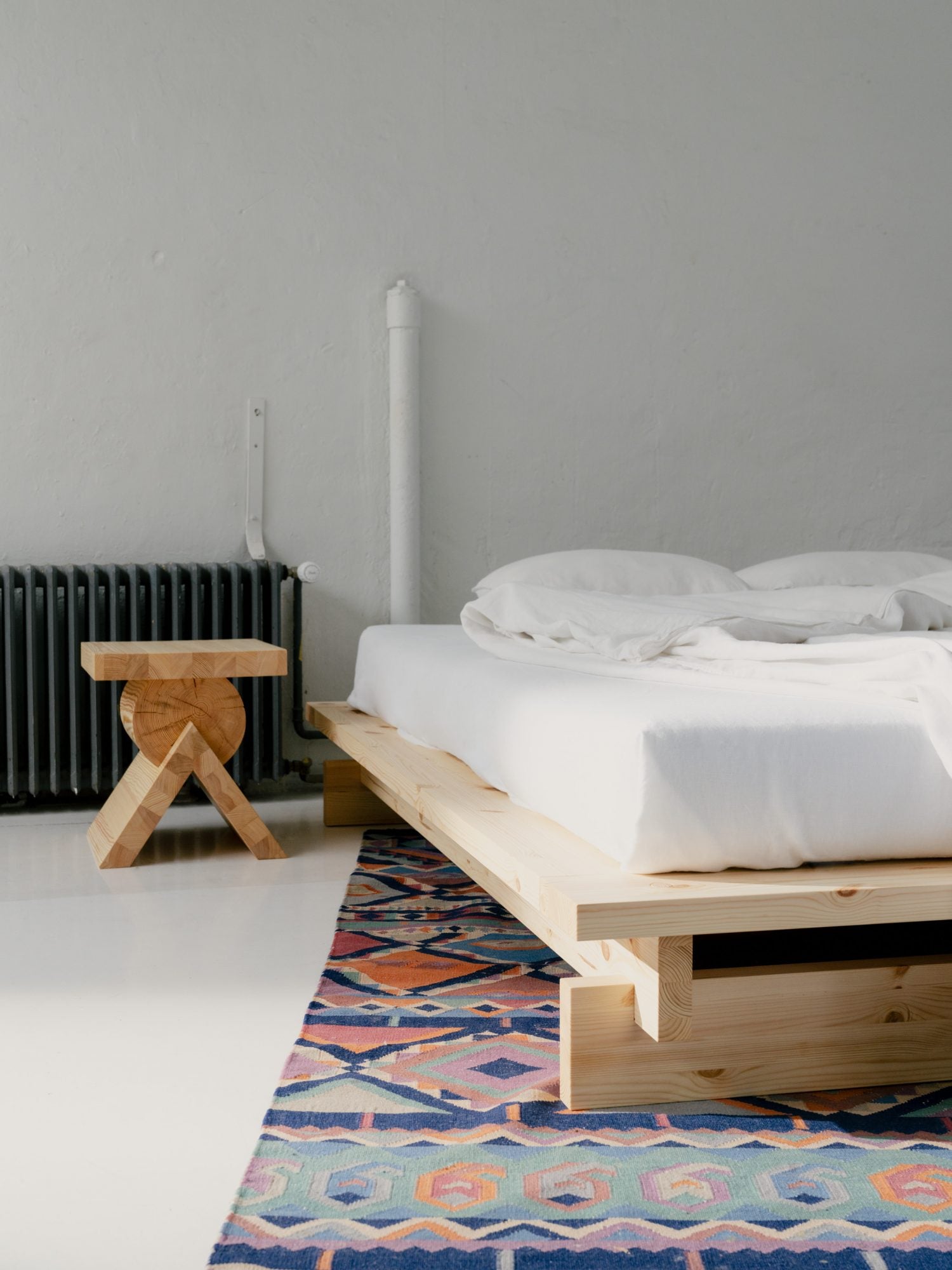 The Aamu wood bed frame is an effortless but essential object for those who demand the same brutally efficient design where they sleep as where they eat and lounge. The Aamu Bed Frame is constructed from reassuringly hefty slabs of Finnish pine, cleverly engineered to slot together without the use of additional fixings. Purposefully designed to be unobtrusive, unadorned and strong, the Aamu Bed Frame has been created by our in-house design team and arrives flat-packed in two sizes. Just add a mattress and the Aamu Bed Frame will be there to support you, every night, for decades to come.
